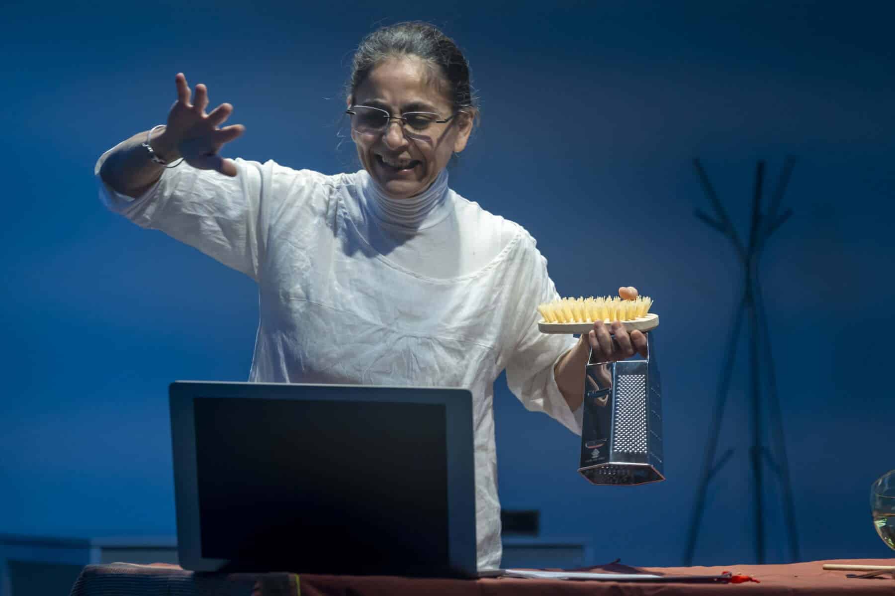 L’attrice-musicista si cimenta nella realizzazione di una ricetta fatta di ingredienti sonori, prodotti in scena con un a piccola orchestra di strumenti-utensili, dando spazio alla fantasia e alla creatività.